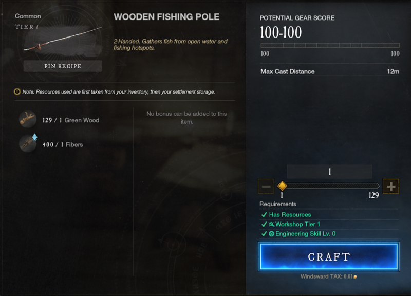 When first starting out you will need a wooden fishing pole to start gathering nodes. This requires engineering level 0 along with 1 fiber and 1 green wood to craft it. Fiber will need a flint sickle and a hemp plant. Once all are obtained a tier 1 camp fire or workshop is required to craft the wooden fishing pole. Once crafted you will need to equip it and you can start gathering.