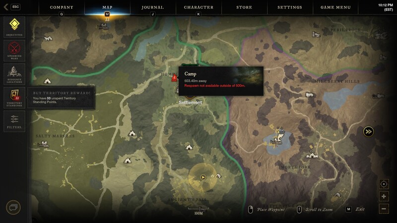 You can craft your camp by pressing the default key Y. This will then give you a ghost camp that you can place. It’s important to note that you will not be able to place a camp within a landmark. The landmarked areas can be identified on your map by dotted or dashed outlines of a specific area. You must be outside a landmark or territory to place your camp. The camp also requires you to be on semi-even ground for the camp placement to work.