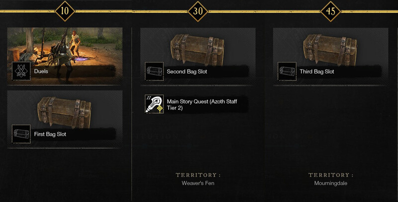 You can increase your storage capacity in 3 ways in the new world. The first is related to your character’s inventory, and not the storage system mentioned above. You can increase the amount of weight/storage capacity your character inventory has by simply leveling up. This will give you access to additional bag slots. New bag slots open up at levels 10, 30, and 45. You can then acquire new bags up to tier V in order to increase the storage capacity per bag which will increase your overall inventory capacity.