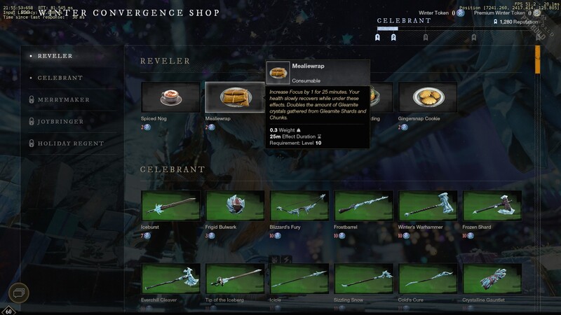 As you progress through the ranks you will unlock the next tier in the holiday store (much like the faction store) that will allow you to purchase holiday event-specific food that will double the amount of gleamite crystals gathered from gleamite shards and chunks, armor, and weapons from tier II up to tier V, Ice themed furniture, and armor and weapon patterns.