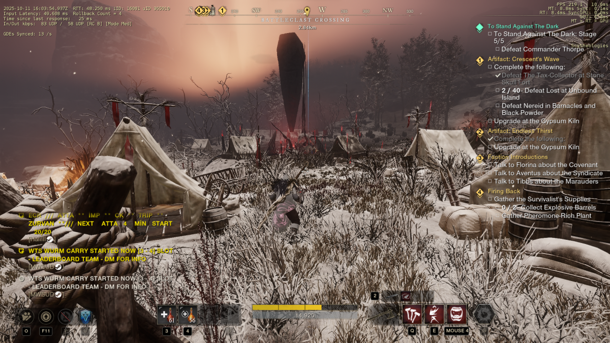Located on the slightly Northern side of Great Cleave you’ll find an infinitely repeating event that spawns mobs and eventually, Thorpe. Repeating this over and over is an easy way to farm and you’ll usually always find players here.